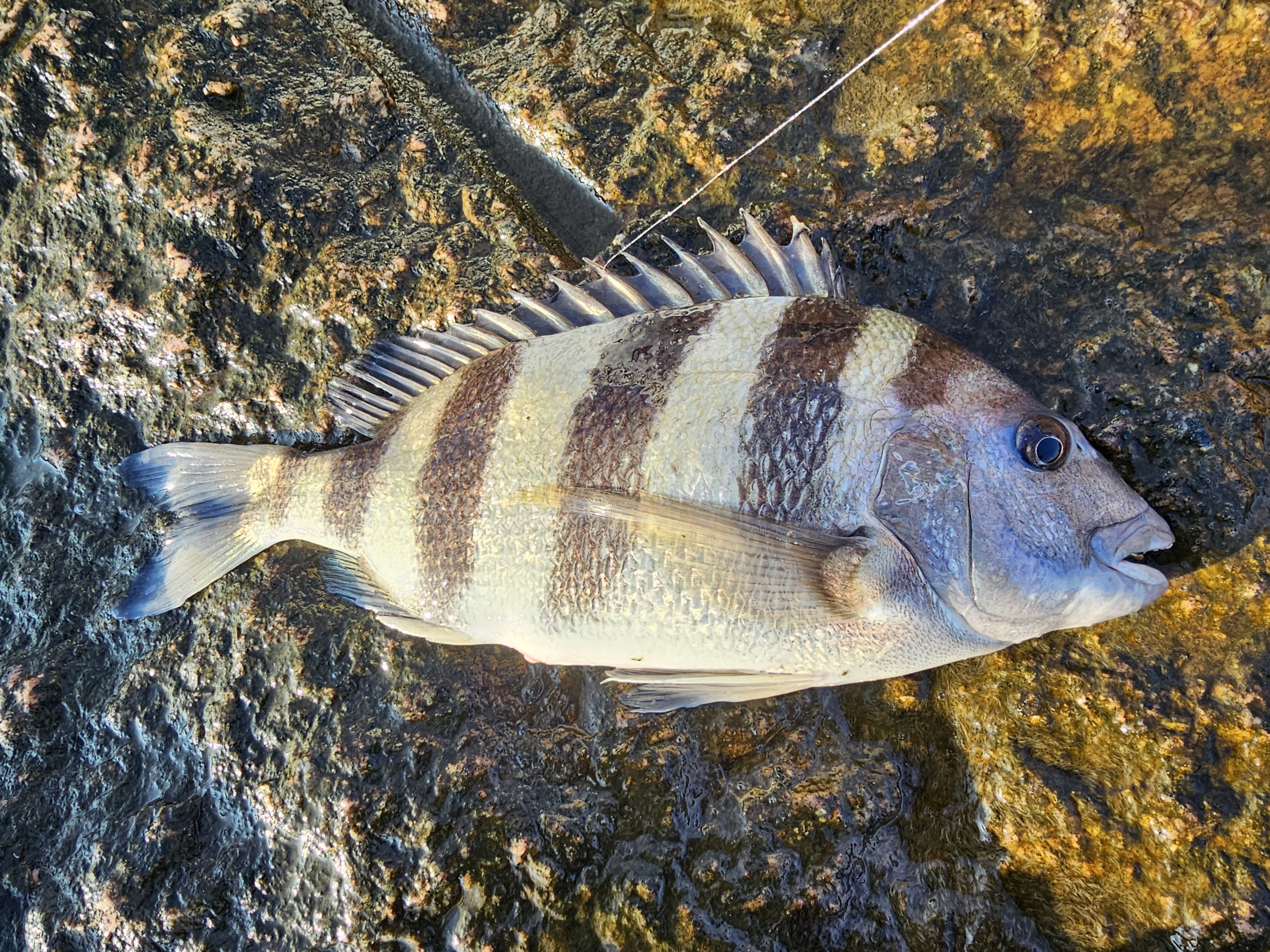 어제는 조류가 거의 가지 않아서 별다른 조과를 내지 못했는데, 오늘은 조류 소통이 잘되어 초반부터 쉽헤드를 낚아 올렸습니다.